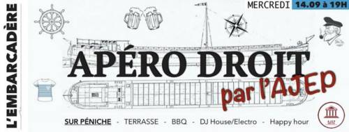 Apres la soirée d’intégration, on vous donne rendez-vous à l’Embarcadère pour notre premier APÉRO DROIT ! Alors venez embarquer sur la toute nouvelle péniche du quai Sainte-Catherine pour profiter de nos offres spéciales :