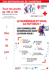 Tous les jeudis à partir du 02 juin - De 10h00 à 13h00 – Avec un conseillé numérique de la Croix Rouge – Permanence d’aide au numérique : Prendre en main des outils numériques, Rechercher un emploi en ligne, Prendre soin de sa santé, Accéder à ses droits, S'informer et se former en ligne, Communiquer avec ses proches, Gérer des données et ses documents personnels, etc. - Ouvert à toutes et tous. Gratuit.