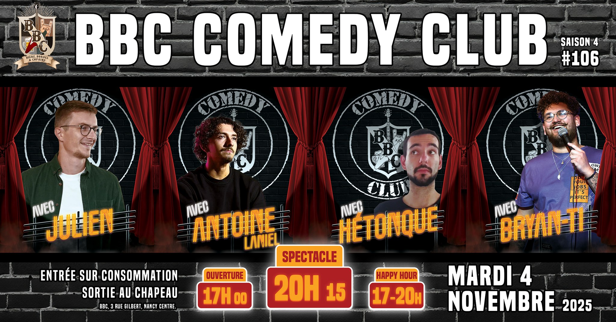 🎤🤣 Édition #106 du BBC Comedy Club (saison 4) – Mardi 4 novembre à 20h15 !