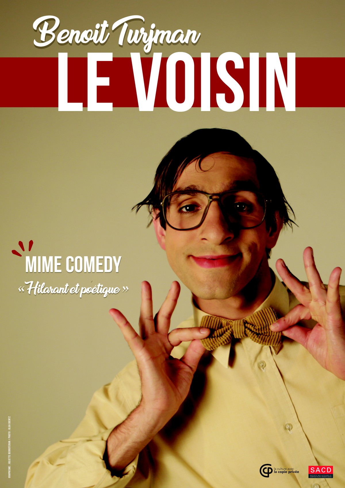 Benoît Turjman est une révélation du mime en France. Formé à l’Ecole Marcel Marceau, Il est l’artiste invité de Pierre Niney dans l’émission "LOL: Qui rit, sort !". Il a joué dans "Je vous trouve très beau" d'Isabelle Mergault et il a été doublure cascade de Rowan Atkinson dans "Les Vacances de Mr Bean". On le retrouve au casting des séries Netflix "Emily in Paris" ou encore "Le Monde de Demain". Après plusieurs tournées nationales, internationales et une programmation au Théâtre du Gymnase à Paris "Le Voisin" débarque à Mutzig. Un bijou unique en son genre par un artiste hors du commun !