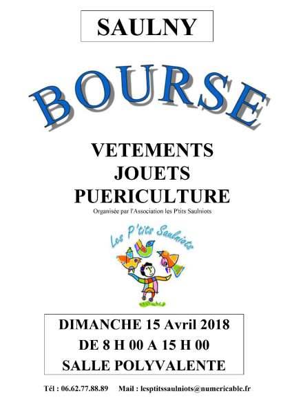 l’Association "Les P’tits Saulniots" organise une bourse aux vêtements et à la puériculture le dimanche 15 avril 2018 à la salle polyvalente de Saulny de 8h00 à 15h00.