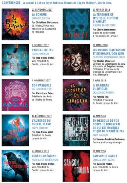 Le Cercle Lyrique de Metz propose de découvrir l’oeuvre 1/2h avant chaque première représentation des spectacles lyriques (au Foyer Ambroise-Thomas de l’Opéra-Théâtre).LES CONFÉRENCES PROPOSÉES PAR LE CERCLE LYRIQUE DE METZ SE DÉCOUPENT COMME SUIT :