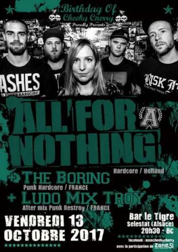 Se râper la glotte pendant les refrains et se faire punir par les beat-down de ALL FOR NOTHING au Tigre, vous le vouliez - Cheeky Cherry le fait pour son 9e anniversaire le vendredi 13 octobre. Le combo de Rotterdam avec leur son fast, Hardcore, groovy, beat-down, mélodique, le tout porté par une chanteuse charismatique à la voix puissante déboule dans le trocson! Ca va jouer vite ça va jouer fort ! La première partie sera assurée par le punk hardcore des copains de THE BORING et si il vous reste un peu d’énergie Ludo Mix-Troy reprend les platines pour un Destroy Birthday after mix !