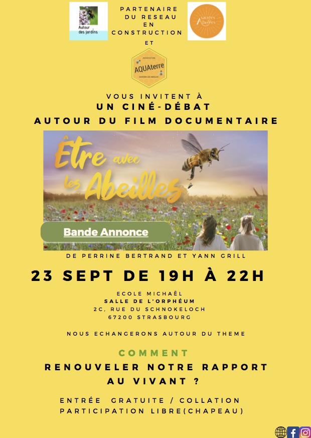 Après la projection du documentaire de Perrine Bertrand et Yann Grill "Etre avec les Abeilles", nous aurons un temps d'échanges, animé par des personnes d'Aquaterre, porteur du projet Apiterre et de l'association Autour des jardins, tous deux partenaires du réseau en construction Sacrées Abeilles.