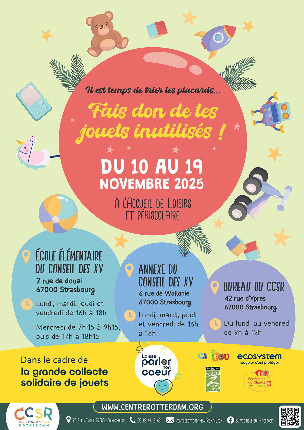 Pour la cinquième année consécutive, l’Accueil de Loisirs du Centre Rotterdam se transforme en point de collecte solidaire de jouets d’occasion du 10 au 19 novembre 2025, à l’occasion de la Semaine Européenne de la Réduction des Déchets et de la collecte « Laisse parler ton cœur ». A l’approche des fêtes de fin d’année, cet appel au don va permettre aux familles les plus modestes d’offrir des cadeaux à leurs enfants, mais également de prolonger la durée de vie de nombreux jouets : c’est un geste en faveur de l’environnement et de l’entraide.