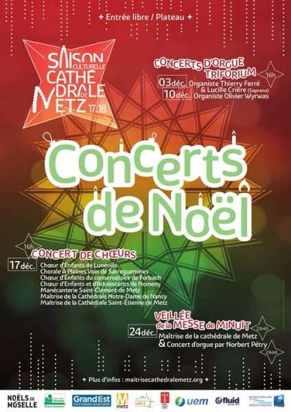 La maîtrise de la cathédrale de Metz invite cette année plusieurs choeurs d’enfants de la région pour son traditionnel concert de l’Avent. Retrouvez les choeurs d’enfants de l’école de musique de Sarreguemines (dir. Laurent Bajou), de l’école intercommunale de Nomeny (dir. Virginie Tirard), de Lunéville (dir. Emmanuel Stark), du conservatoire de Forbach (dir. Michèle Bastian), la manécanterie Saint-Clément de Metz (dir. Pierre Falkenrodt) et la Maîtrise de la cathédrale de Nancy (dir. Marie-Laure Deldemme), qui vous interprèteront, entre autres, du répertoire traditionnel de Noël et la Messe de minuit de Sébastien Brossard.