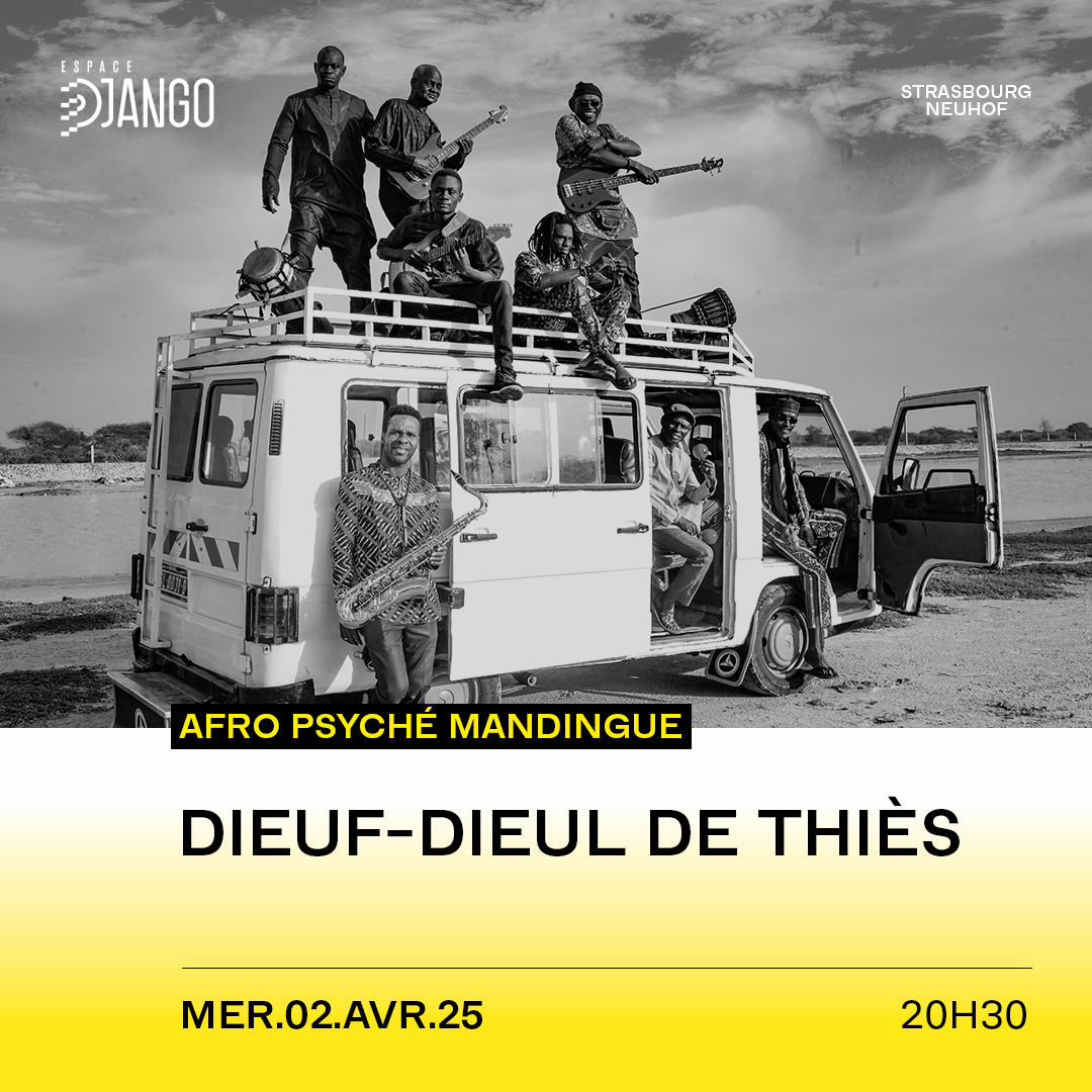 La vie des orchestres africains est souvent pleine de rebondissements et d’histoires incroyables. Le Dieuf-Dieul ne déroge pas à la règle. Créé à la fin des années 70, réformé dans les années 2010, il fait rayonner la culture mandingue de Thiès aux quatre coins du monde. Dans la lignée de leur compatriotes du fameux Baobab, le Dieuf-Dieul de Thiès viendra électriser le Neuhof avec des solos de guitare électrique psychédéliques, une section de cuivres ultra funky et la langue wolof qui exprime les histoires du quotidien et la transmission des traditions et de la spiritualité. Le Dieuf-Dieul de Thiès c’est profond, c’est rythmique, c’est mythique et surprenant, c’est donc à vivre et à partager, absolument.