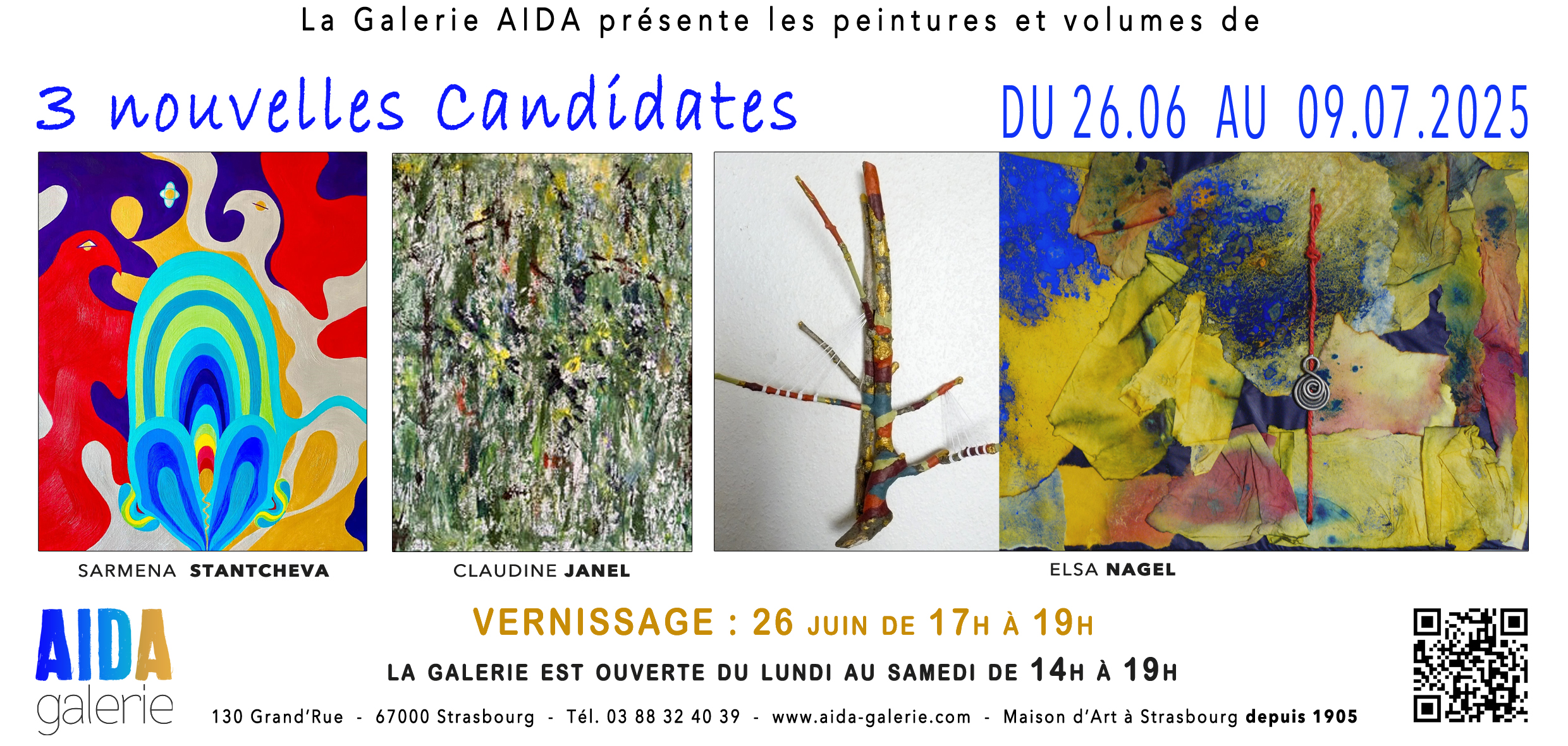 AIDA Galerie présente les réalisations de trois candidates aux Artistes Indépendants d’Alsace (AIDA). Leurs oeuvres s’offrent ici au regard du public autant qu’à l’appréciation des membres du Comité, chargés d’évaluer les candidatures. Une fois leur adhésion validée, elles pourront exposer régulièrement au sein de la galerie. L’exposition réunit des peintures abstraites portant les empreintes de la nature, des collages de matières mi-brutes, mi-précieuses et des toiles d’inspiration cosmogonique, marquées par une figure mythique imaginaire.