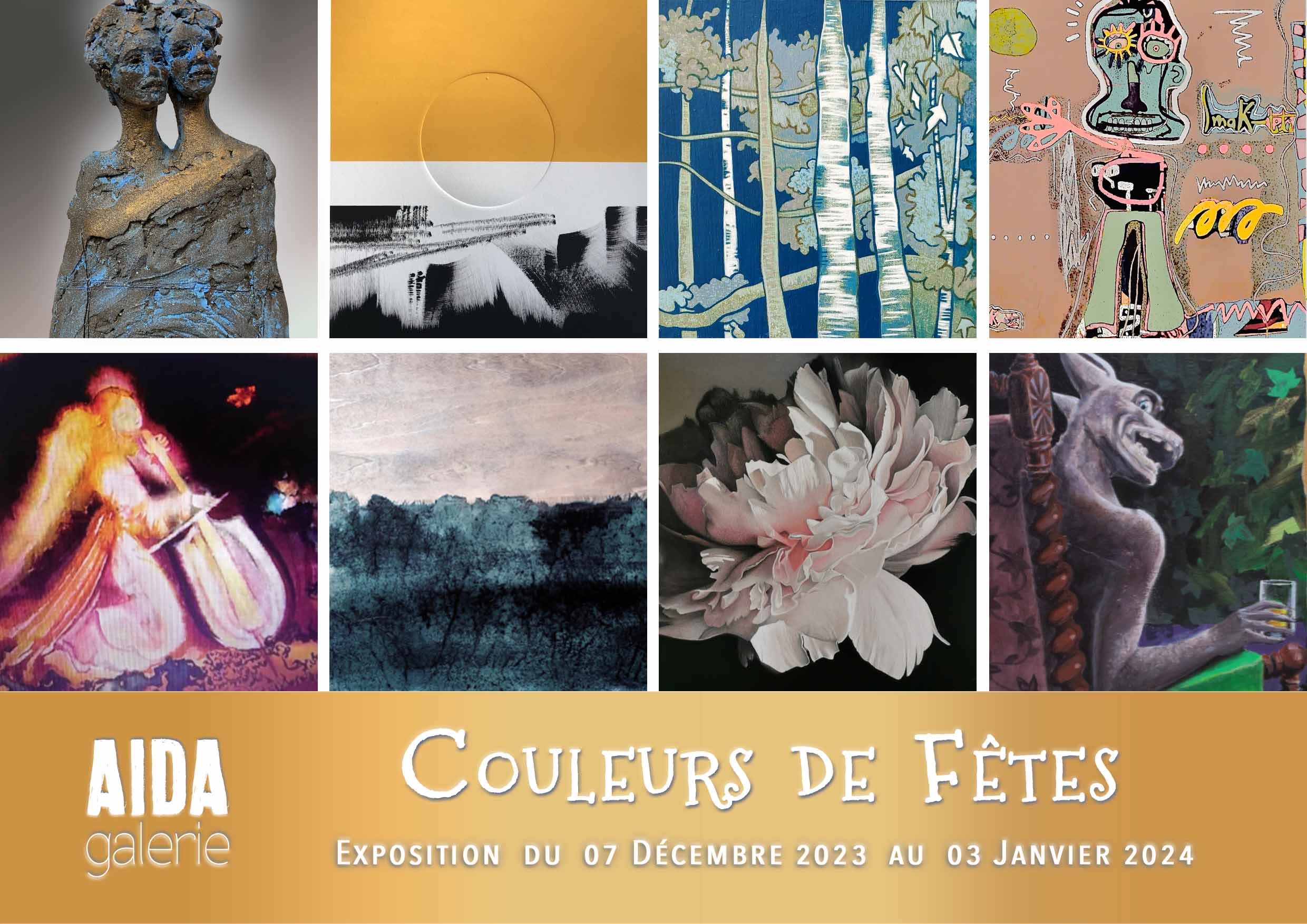 A l’occasion de ce mois de décembre festif, AIDA Galerie a réuni les créations de 8 artistes pour réaliser une belle palette de couleurs. Au programme pour les fêtes : de la poésie, du fantastique, des sensations, du rêve, de l’électricité, des arbres, beaucoup d’amour et un peu de joyeuse nostalgie