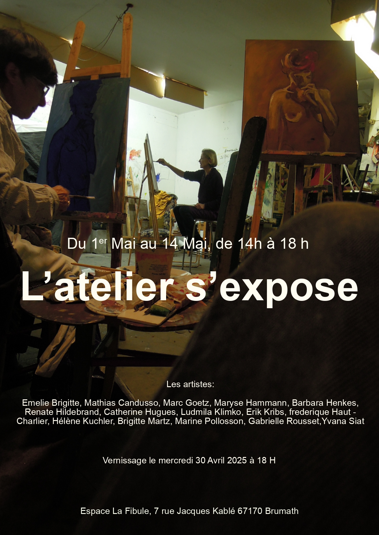 L'atelier de Christophe Wehrung se situe dans une des ruelles qui courent au pied de la cathédrale de Strasbourg. Christophe a proposé aux amateurs de peinture qui fréquentent son atelier de s'investir dans une exposition commune, dans le bel espace La Fibule à Brumath. L'accrochage, le choix et la mise en valeur d'une oeuvre, s'organisent comme une peinture. Chacun, à son niveau, a fait un choix dans ses travaux exécutés lors des cours ainsi que dans sa production personnelle.