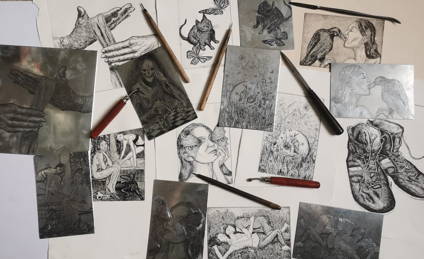 L’atelier est spécialisé avant tout dans la pratique de la taille-douce. Nous pratiquons les différentes techniques qui y sont associées comme la taille directe, l’eau-forte, l’aquatinte, la manière-noire.