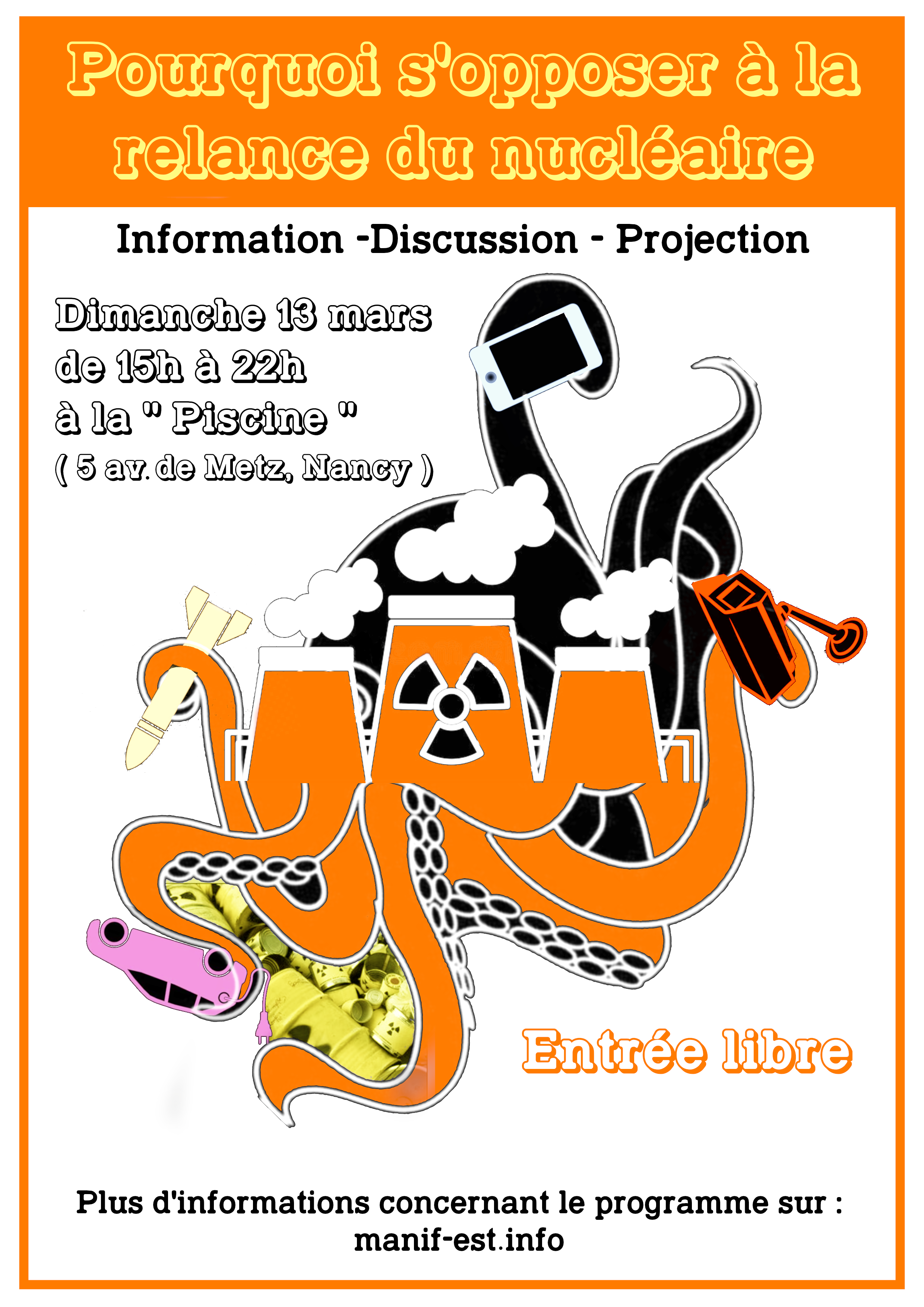 Dans la lignée émancipatrice et révolutionnaire des critiques (réellement écolo) des années 1970 est organisée une journée antinucléaire à "La Piscine", 5 avenue de Metz à Nancy-Maxéville, le dimanche 13 mars dès 15h.