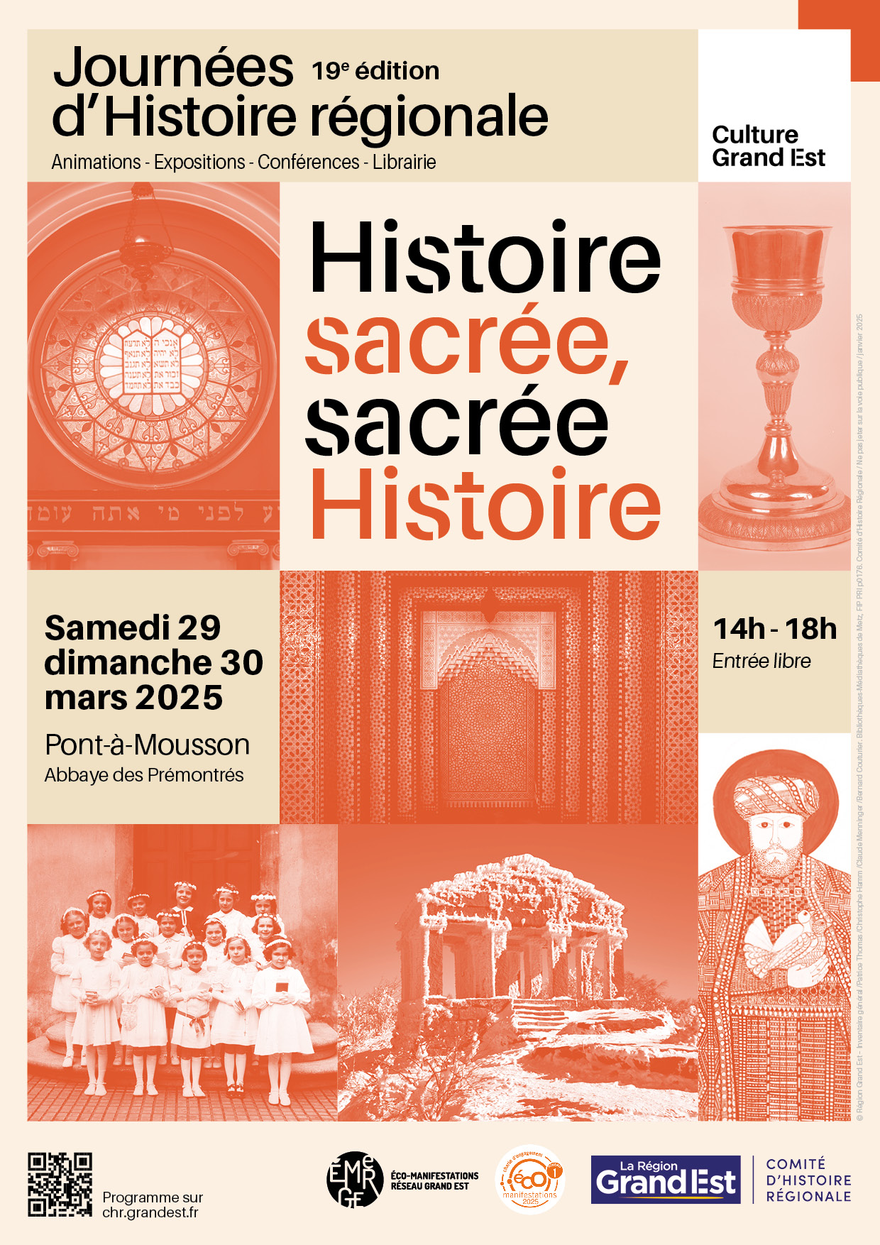 Organisées par la Région Grand Est, via son Comité d’Histoire Régionale, ces journées ont pour but de faire connaître au plus grand nombre les richesses historiques et patrimoniales de la région et l’histoire religieuse qui a façonné les territoires des territoires depuis l’Antiquité. Cet événement rassemblera plus de 110 structures de l’Histoire et du patrimoine venues de tout le Grand Est, associatives ou institutionnelles, qui présenteront durant ces 2 jours, de nombreuses expositions, des animations, ateliers, concerts, spectacles, démonstrations, conférences. Les expositions et animations seront ouvertes au grand public samedi et dimanche de 14 h à 18 h. Le dimanche matin, une matinée de conférences "À la découverte du passé religieux de Pont-à-Mousson" est proposée. Entrée libre pour l’ensemble des animations du week-end. Programme sur http://chr.grandest.fr
