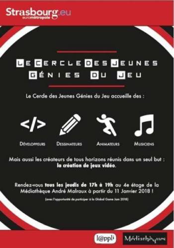 Le Cercle des Jeunes Génies Du Jeu, atelier de création de jeux vidéo, projet ambitieux au long cours, prend place tous les jeudis de 17 à 19h à la médiathèque Malraux, en salle de formation de L@ppli, à côté du #Gametisch (4è étage).