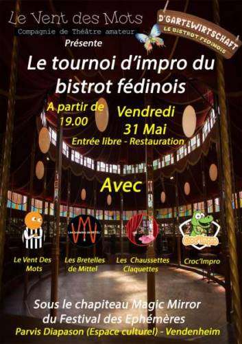 Dans le cadre du bistrot fédinois, l’atelier de théatre d’ilmprovisation fédinoise Le Vent Des Mots vous propose son grand tournoi.