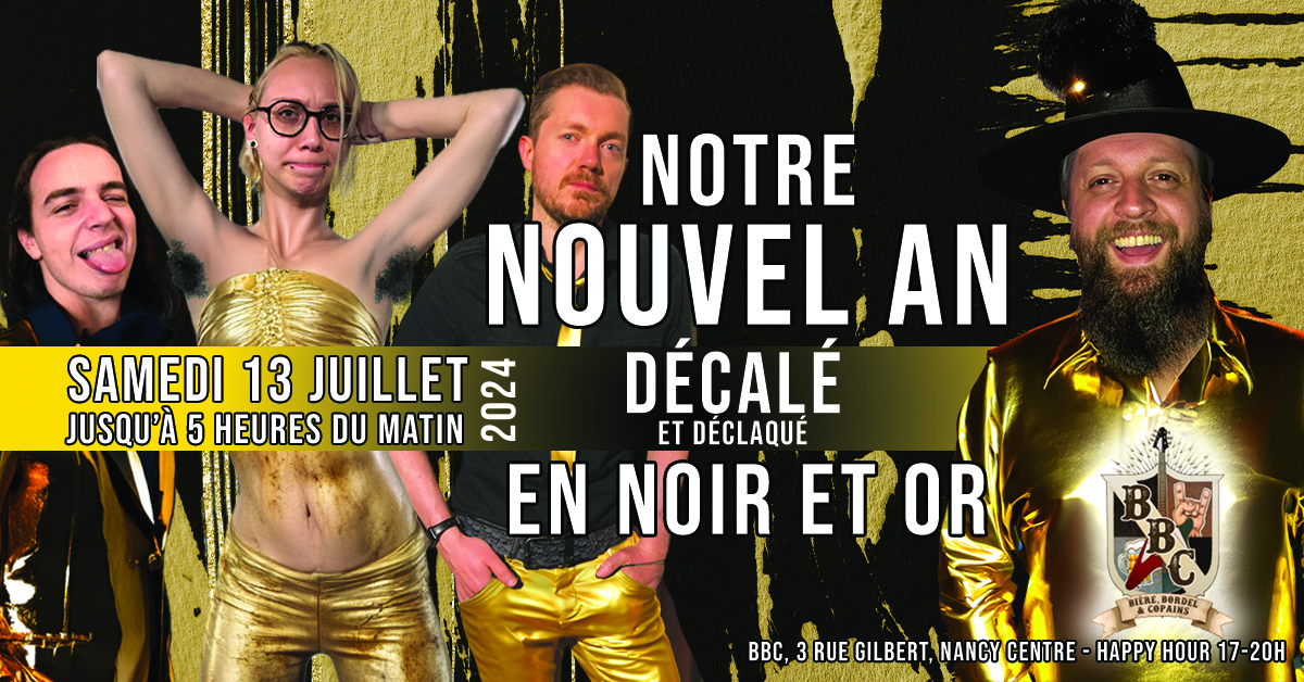 Le samedi 13 juillet, préparez-vous à célébrer la nouvelle année de la manière la plus décalée qui soit ! Comme chaque année, le BBC vous invite à son Nouvel An décalé, et cette fois, nous allons briller sous le thème "Noir et Or". ??