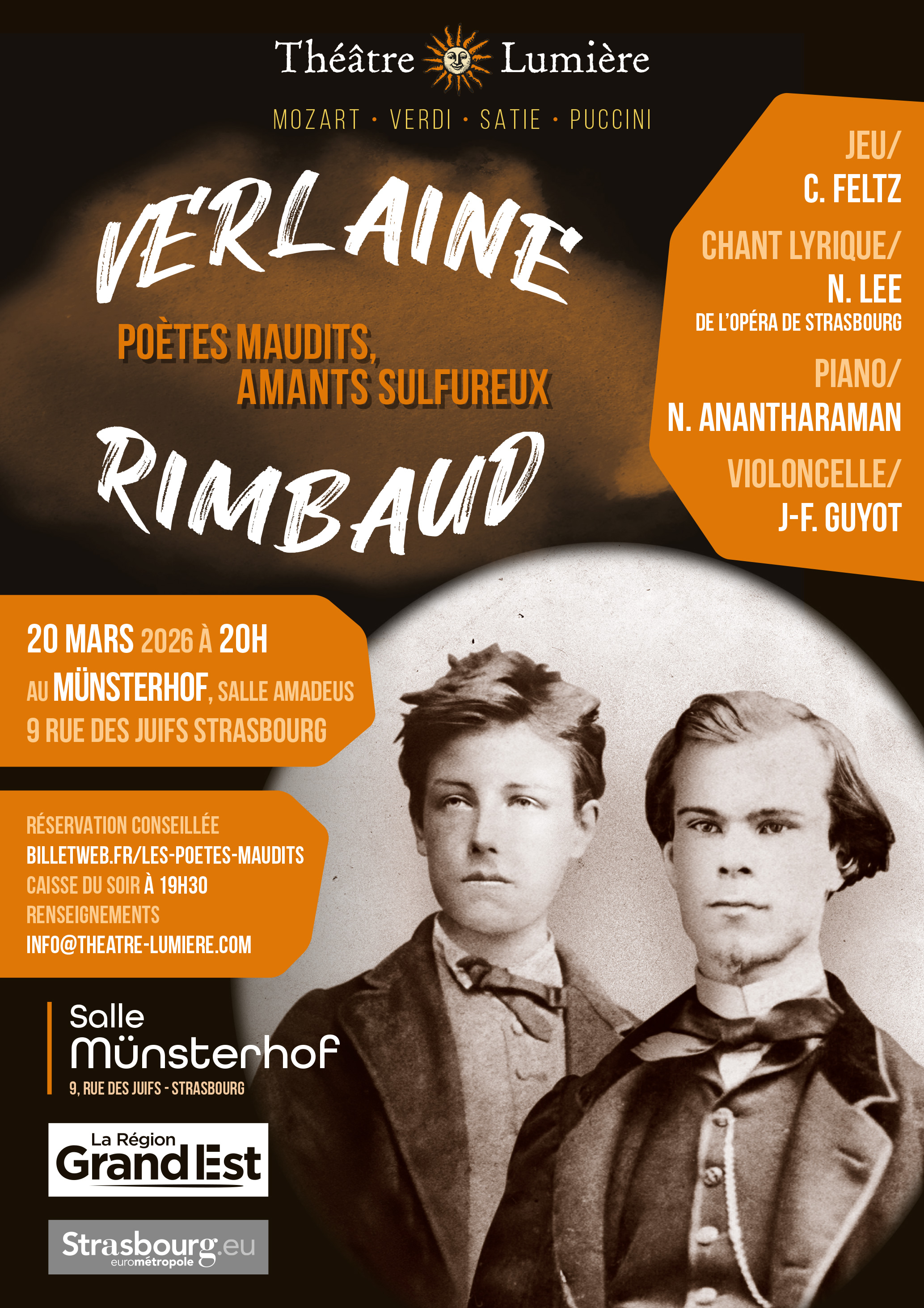 Spectacle de poésie musicale « Poètes Maudits, Amants Sulfureux » d’après les œuvres de Paul Verlaine & Arthur Rimbaud avec Christophe Feltz (jeu) & Namdeuk Lee (chanteur à l’Opéra de Strasbourg), Jean-François Guyot (violoncelle) & Nalini Anantharaman (piano) le vendredi 20 mars 2026 à 20h à la salle « Amadeus » du Münsterhof, 9 rue des Juifs à Strasbourg.