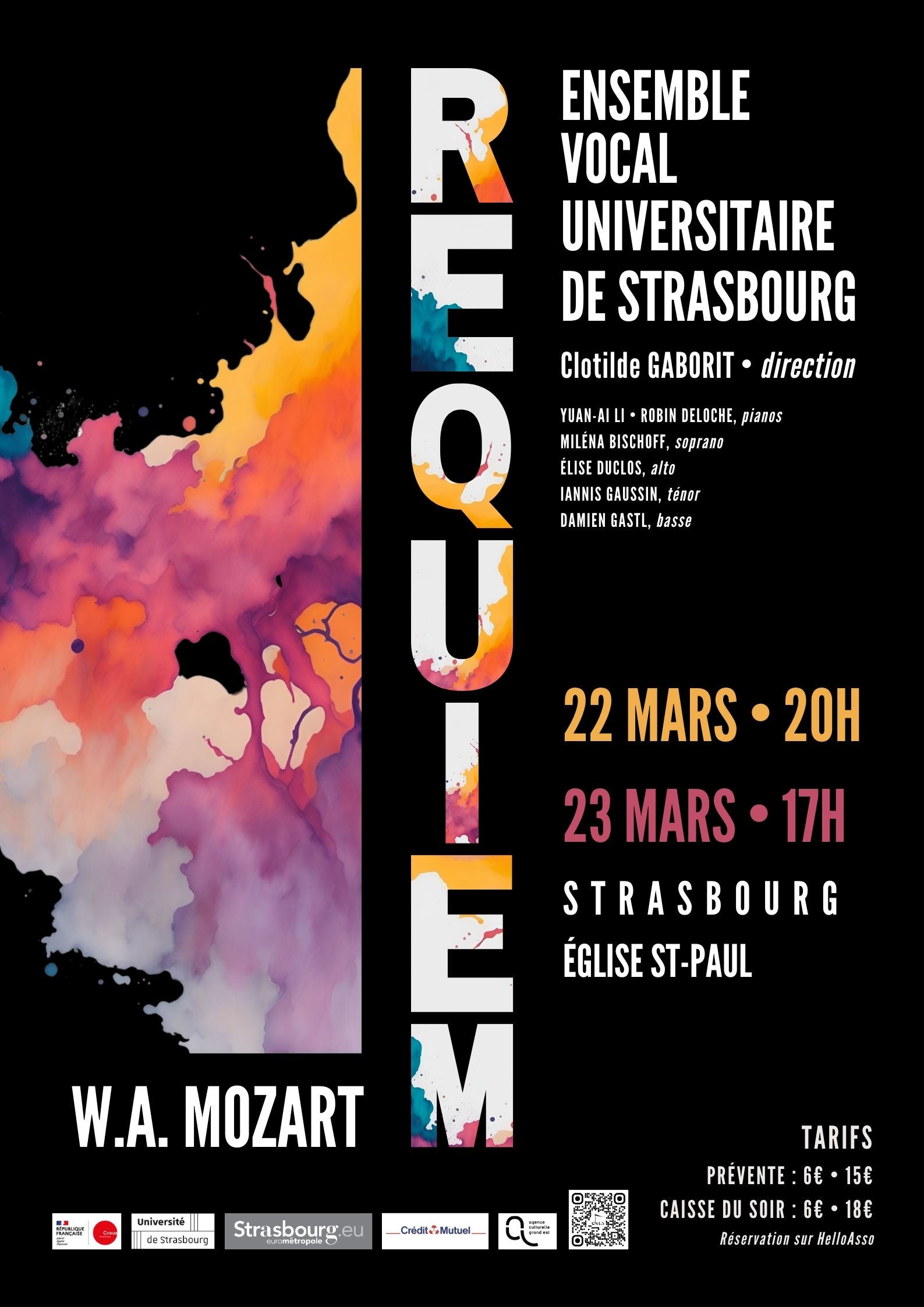 L'Ensemble Vocal Universitaire de Strasbourg a le plaisir de vous inviter à une série de concerts consacrés au Requiem de Mozart, présenté dans un arrangement pour chœur, solistes, deux pianos et timbales. Ce choix d’orchestration met en lumière toute la profondeur et l’intensité de l’œuvre tout en révélant une nouvelle transparence sonore, à la croisée de la puissance orchestrale et de l’intimité du piano.