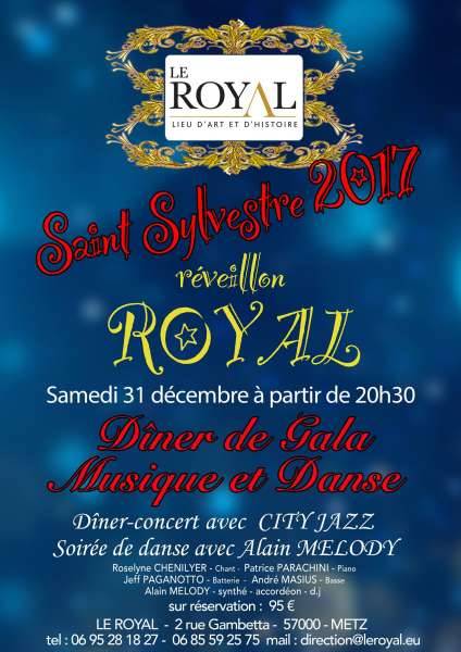 Menu de Réveillon Royal : Amuse-bouche, flûte de champagne / Foie gras de canard accompagné de Chutney de Mangue et Kiwi / Sorbet citron et Limencello / Pièce de jumeaux cuit 48h basse température avec sa sauce aux truffes, demi-pomme de terre aux truffes et rossana de carottes / Duo de fromages affinés, mesclun de salade aux noix / Palet chocolat-caramel / Bordeaux Coulonges (1 bout./3 pers.) - eau minérale - café.