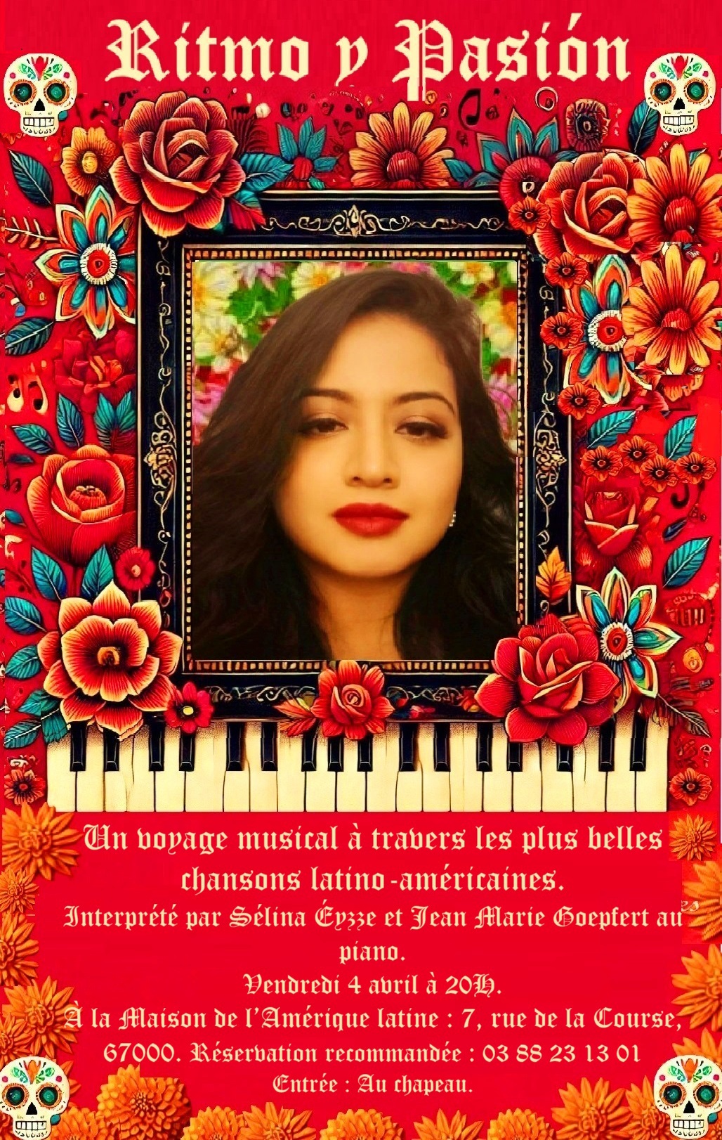 Venez à vous dépayser en fessant une promenade musicale dès le Mexique jusqu'en Argentine. Les plus belles chansons des divers pays latino-américains, interprètes par Sélina Éyzze accompagnée au piano par Jean-Marie Goepfert.