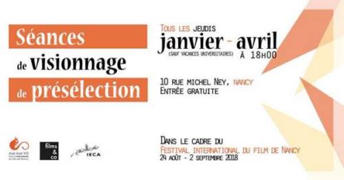 , les séances de visionnage de présélection des courts-métrages français ou étrangers invitent le public à découvrir des films inscrits en compétition. Organisées de janvier à avril 2018 par le Festival international du film de Nancy, avec la participation du Film & Co. (étudiants de l’IECA), ces projections sont aussi l’occasion pour chacun d’exprimer son point de vue. Une façon originale de participer à la présélection de la compétition de courts-métrages du prochain festival qui aura lieu du 24 août au 2 septembre 2018.