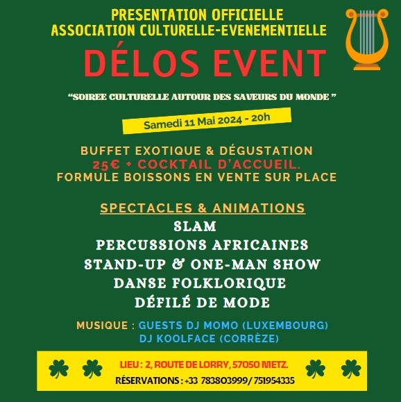 Pour le long week-end de l’ascension, L’Association Culturelle Délos Event, avec le soutien de la Communauté Togolaise de la Moselle, vous invite à une soirée culturelle autour de la gastronomie, en soutien à la création artistique contemporaine et au lancement de ses activités récréatives.