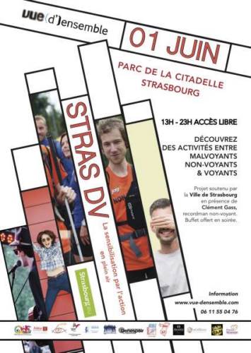STRAS DV l’évenemnt innovant et inspirant de l’association Vue (d’) ensemble soutenu par la ville de Strasbourg où la sensibilisation au handicap visuel passe par la fête en plein air. Concert, exposition photos, athlétisme, projection film, animation, Yoga, danse, jeux, Braille.... Buffet offert en soirée.