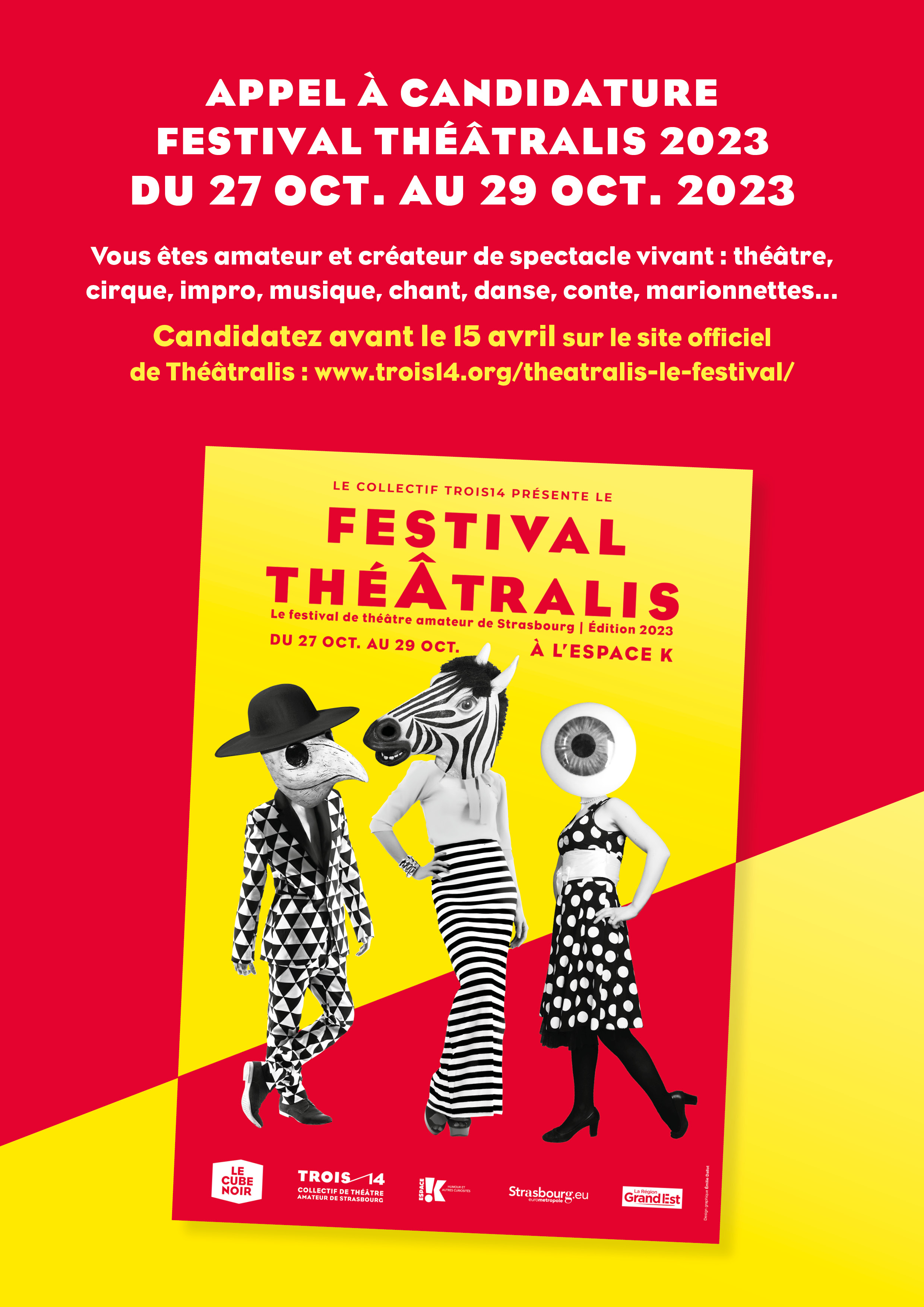 Pour l’Édition 2023, le Collectif Trois14 organise ThéÂtralis, le festival du spectacle vivant amateur de Strasbourg, du vendredi 27 au dimanche 29 octobre 2023 à l'espace K.