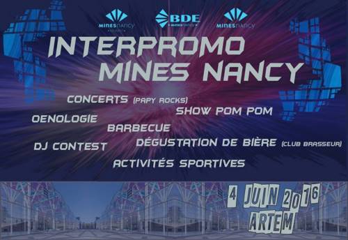 Le samedi 4 Juin 2016 se tiendra à Nancy l’annuelle Interpromo qui rassemble les étudiants des Mines de Nancy et les anciens des quatre coins du monde. Le BDE vous convie à nous rejoindre pour partager cette journée où nous nous retrouverons dans un cadre informelle pour partager de bons moments. Au programme : concert des papys rocks et de mineurs, séance d’oenologie, dégustation de bière artisanale, activités sportives, etc...