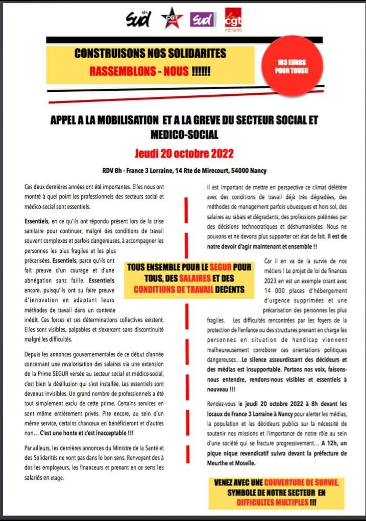 Suite à L'Assemblée Générale du TRAVAIL SOCIAL le 6 octobre 2022 à NANCY, ses membres ont très largement voté pour une nouvelle journée de grève et de mobilisation pour le secteur social et médico-social. Il est temps d'amplifier les actions en faveur d'un secteur en proie à la perte de sens, à la marchandisation et à l'iniquité. Nous nous félicitons encore de l'union de structures différentes, de divers syndicats et de l'envie de construire collectivement les contours de notre avenir... Prime SEGUR de 183 euros pour tous, vigilance par rapport à une nouvelle convention collective , augmentation des salaires et des budgets dans le secteur social et médico-social , amélioration des conditions de travail, tous les indicateurs sont malheureusement au rouge. Il ne tient qu'à nous d'inverser la tendance en affichant notre détermination !! Rendez-vous le jeudi 20 octobre 2022 pour une action forte et visible à 8h00 devant France 3 et pique nique revendicatif à 12h00 devant la préfecture !!! Venez avec une couverture de survie, symbole de notre secteur en difficultés multiples !! On lâche rien !!