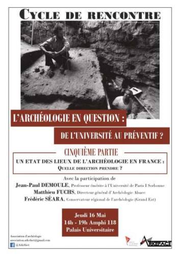 Dans la continuité des rencontres qui se sont déroulées tout au long de l’année sur le thème « L’archéologie en question : De l’Université au préventif - », nous organisons le 16 mai une après-midi de discussions. Le but sera d’esquisser un bilan de l’état actuel de l’archéologie en Alsace, et plus largement en France. Animeront le débat et répondront aux questions, Jean-Paul Demoule, ancien directeur de l’INRAP et professeur émérite à l’Université de Paris I Sorbonne, Matthieu Fuchs, Directeur général d’Archéologie Alsace, et Frédéric Séara, Conservateur régional de l’archéologie (Grand Est).