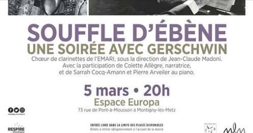 Elle vous contera avec tout son talent quelques faits marquants de la vie de George Gershwin le tout ponctué par des interventions soit de Clarinette et piano soit de piano à 4 mains soit de chant et piano soit de pièces symphoniques avec le Souffle d’Ébène, tel qu’un florilège des thèmes de"Rhapsodie in Blue" dans un arrangement pour ch?ur de clarinettes de Pierre Arveiler ou encore la suite pour orchestre arrangée pour le Souffle d’Ébène par Daniel Hue du célèbre" Américain à Paris"....
