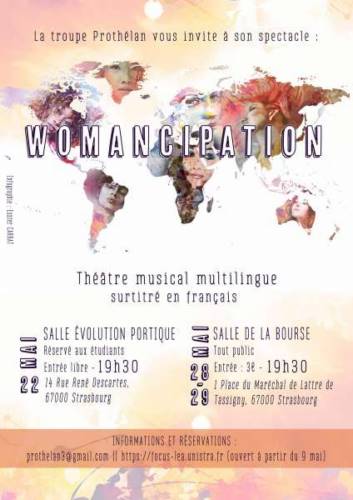 Prothélan, a été créé en 2014 par les étudiants de la Faculté des Langues de l’Université de Strasbourg. Son objectif est d’encourager un ensemble d’activités artistiques autour de la production d’une pièce de théâtre multilingue et musicale. Sur un thème universel, la pièce suit une trame qui relie des scènes du répertoire classique et contemporain jouées en langue originale. Ce fut Polyglove en 2014-15, qui traitait de l’amour en allemand, anglais, espagnol, italien et français. Dédiée à la folie, Locomotive a ajouté à ces langues l’alsacien en 2015-16. Cette année, Prothélan revient avec Womancipation, une pièce sur le thème de l’affirmation féminine.