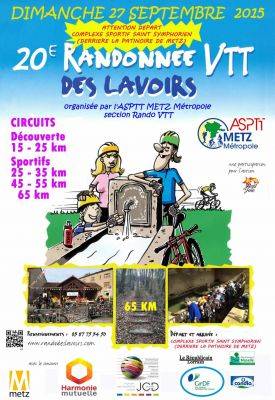 Le dimanche 27 Septembre 2015 l’ASPTT Metz-Métropole section RANDO-VTT organise sous l’égide de la fédération des ASPTT la 20ème Edition de la Randonnée VTT des Lavoirs avec le concours de la VILLE de METZ, de JCD-Groupe, d’Harmonie Mutuelle, de LOGIEST, de GrDF, du CONSEIL GENERAL de la MOSELLE et du REPUBLICAIN LORRAIN.
