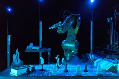 Joris Mathieu repousse les limites du spectacle vivant en créant un théâtre déambulatoire sans humains, aux dialogues interprétés par des imprimantes 3D et un bras articulé. Artefact, pièce d’un genre nouveau, nous convie à un rêve éveillé, habité de marionnettes mécaniques ayant supplanté l’Homme. Écouteurs rivés aux oreilles, nous assistons au dialogue entre un personnage et une Intelligence Artificielle désireuse d’apprendre… et de faire du théâtre. La disparition de son “tuteur” la laissera seule aux commandes d’un ballet mécanique virtuose, troublant et fascinant, sur des vers de Shakespeare et de Beckett. Dans ce théâtre où les récits prennent vie au travers d’imprimantes 3D – sortes d’objets-castelets –, l’absence totale d’êtres humains laisse un vide gorgé de questions : résisterons-nous au séduisant pouvoir des machines que nous fabriquons - Cette fable en Fab Lab interroge l’avenir de l’homme, son rapport au vivant et au développement technologique exponentiel.