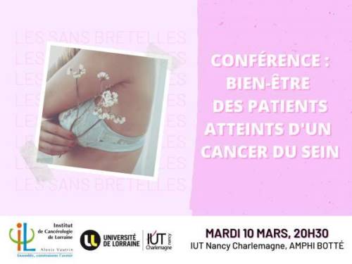 L’association des Sans Bretelles qui oeuvre à récolter des fonds reversés directement à l’Institut de cancérologie de Lorraine, organise Mardi 10 mars 2020 une conférence. Cette dernière portera sur le bien-être des patients atteints d’un cancer du sein.