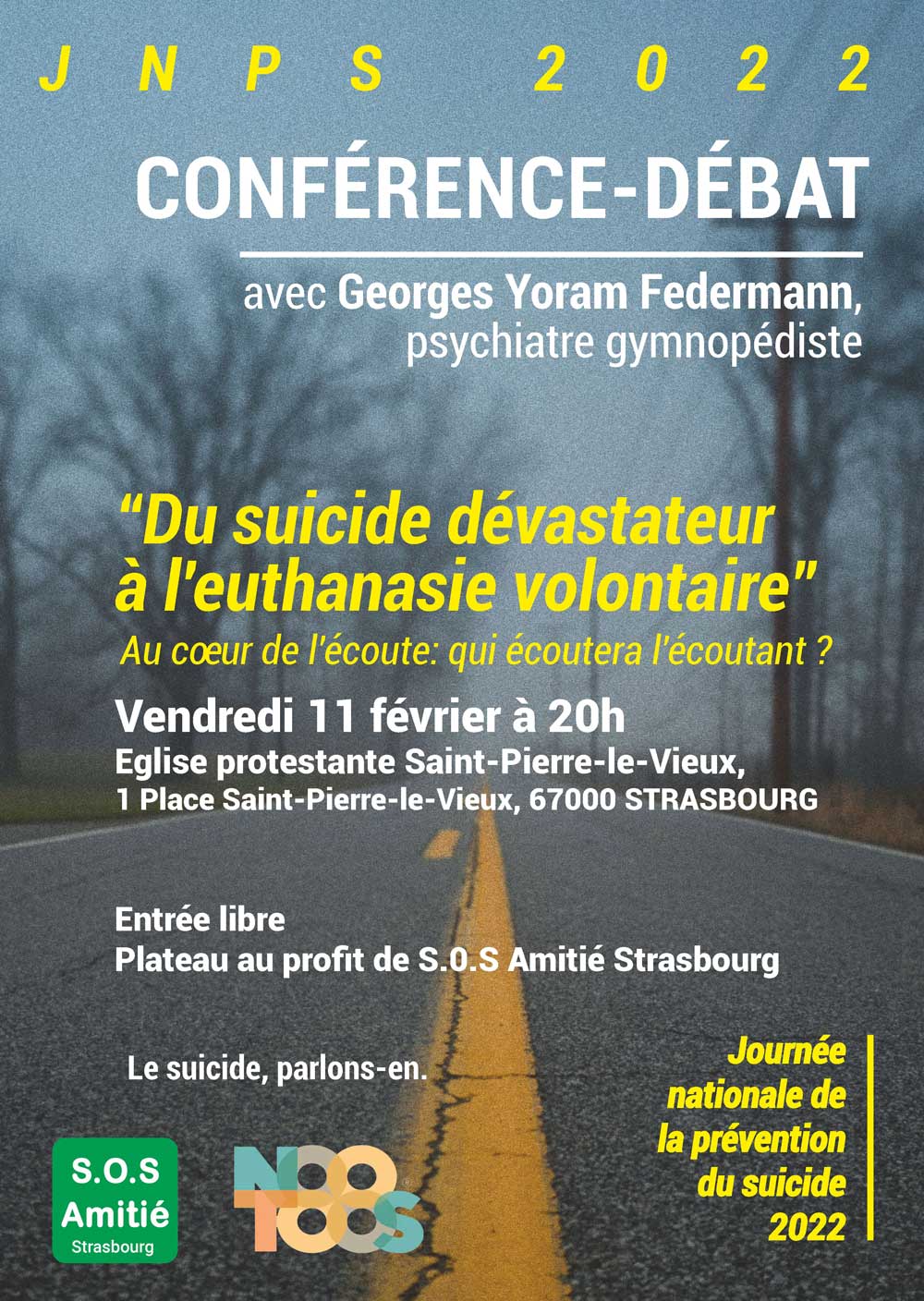 La conférence est organisée par SOS Amitié Strasbourg à l'occasion de la JNPS 2022. Le suicide tue 9000 personnes par an.