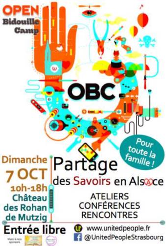 Voici la seconde édition de l’Open Bidouille camp Alsace : #Partage des #Savoirs qui aura lieu le dimanche 7 octobre 2018 au Château de Rohan à Mutzig en partenariat avec la Ville de Mutzig et l’association United People.