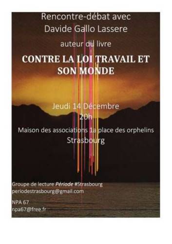 Le groupe de lecture strasbourgeois de la revue Période (revueperiode.net) et le NPA67, vous invitent le jeudi 14 Décembre à une rencontre-débat avec Davide Gallo Lassere, membre du comité éditorial de la revue Période et auteur de Contre la loi travail et son monde. Argent, précarité et mouvements sociaux(Eterotopia, 2016) : http://www.eterotopiafrance.com/catalogue/contre-la-loi-travail-et-son-monde/