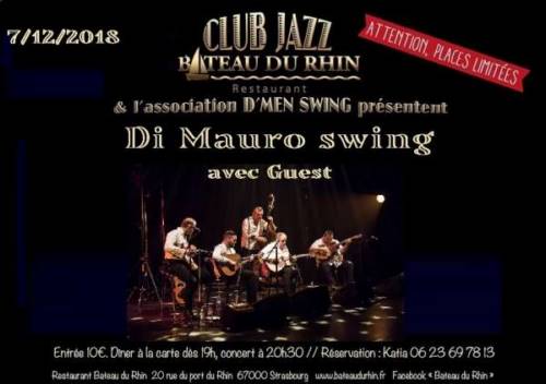 l’élève du maitre Tchavolo Schmitt. En 1985 il est à la tête du « Trio Reinhard » qui connaîtra un franc succès aussi bien sur la scène nationale que sur quelques grandes scènes internationales. Au bout de quelques années Francky Reinhard décide d’arrêter le projet trio pour de nouvelles aventures. Il se consacre à différentes formations mais également à l’enseignement de la guitare manouche, il souhaite redonner tout ce qu’on lui a appris. Il perpétue ainsi cette tradition manouche : la transmission.Puis vient la rencontre avec l’accompagnateur et chanteur Claude Loeffler et le contrebassiste chanteur Perry Lamielle.L’alchimie est évidente entre ces trois là si bien qu’ils décident immédiatement de créer une formation ouverte sur les musiques du monde en gardant le jazz manouche comme ciment de leur groupe. Ils composent, écrivent de nouvelles chansons… ils s’inspirent de leur vies, leur rencontres, de leurs histoires… Jessy le fils de Francky Reinhard vient rejoindre le groupe pour apporter encore plus de swing. Puis leur attirance pour la musique tsigane est évidente, il faut un violoniste. C’est Mathias Hecklen-Obernesser qui va assumer cette place importante dans ce nouveau quintet qui porte désormais le nom de Di Mauro Swing, en hommage au célèbre luthier Joseph Di Mauro qui à confectionné entre autre la guitare de Francky.Leur premier disque « flamme manouche » est enregistré et sera un succès. Ils se produisent depuis plusieurs années sur les plus grandes scènes Européennes : festival jazz manouche (Zillisheim), festival jazz (colmar) ,festival wolfi jazz (wolfisheim), festival de Turin, Francfort, Berlin, Anvers, Bruxelles, Linx (Autriche), Ludwigsburg ou ils se produiront accompagné par l’orchestre philharmonique.En France festival d’Angers, Maubec, Tarente, Colmar, Rouffach, Rennes, Genlis, Château du Hohlandsbourg etc….fevrier 2007 Le deuxième disque est enregistré, la sortie juin 2017. Nouvelles tournées, nouvelles histoires ànous raconter.asister à un concert de Di Mauro Swing c’ est vivre un pure moment de bonheur, de partage, de fête, ou seul règne le plaisir de jouer et la sincérité …