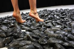 Soudain, elle y est, pénètre ce champ de galets. Et se glisse dans cet espace... Et ce jeu de recommencer...pour inventer sa place.