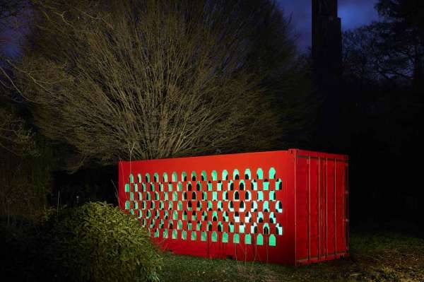 Ce container maritime, découpé comme une dentelle, est dédié à la lumière qui le traverse le jour.