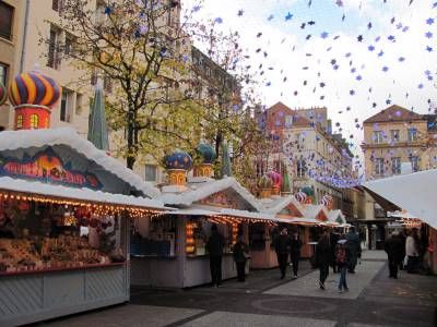 Les coutumes sont respectées sur la place Saint-Jacques. Noël joue avec l’émerveillement et les lumières.