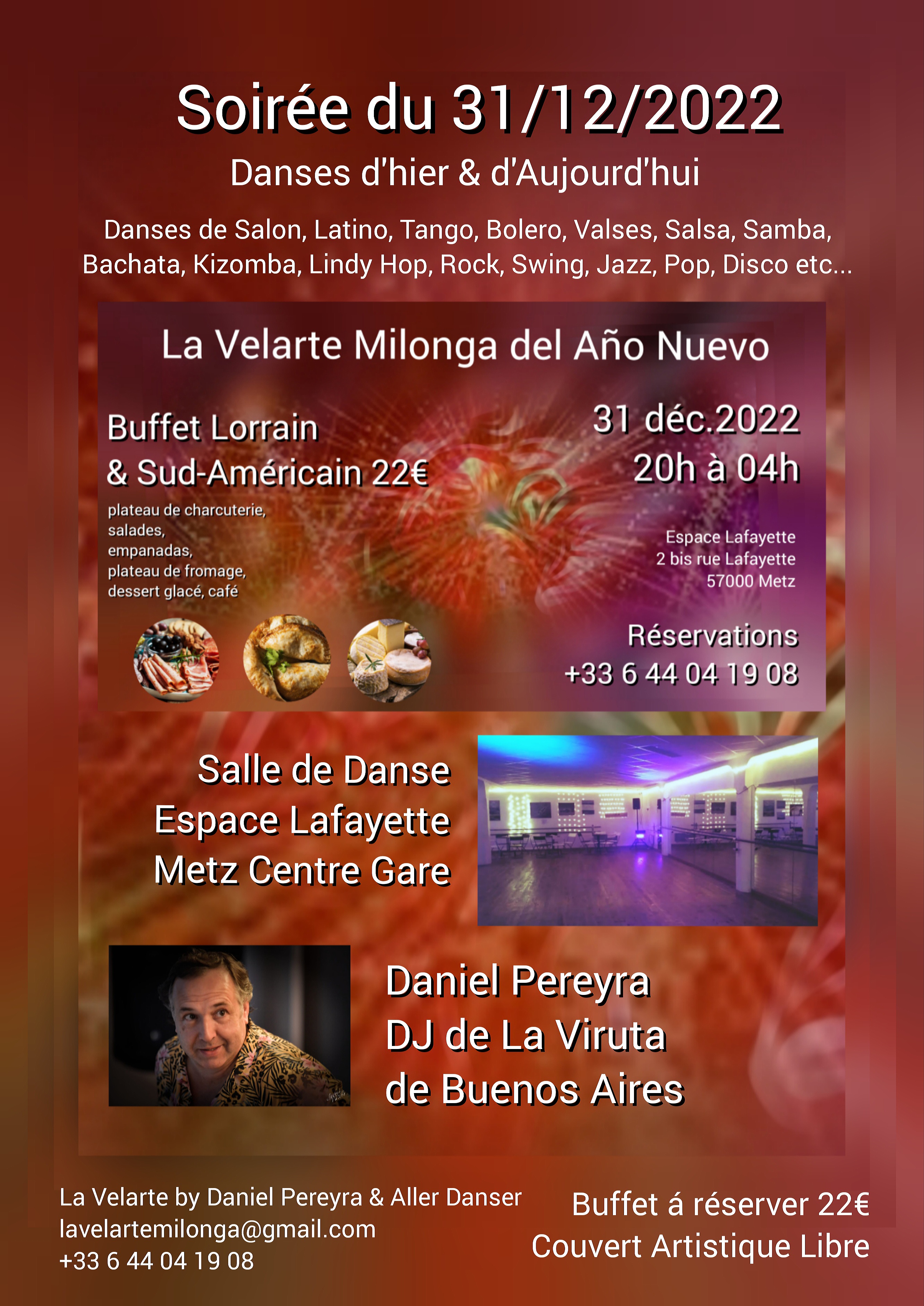 La Velarte vous invite à fêter joyeusement le passage à la Nouvelle Année le 31/12 avec une milonga spéciale toutes danses et la musique sélectionnée par Daniel Pereyra, DJ de La Viruta de Buenos Aires, et un buffet "mescla lorrain et sud americain" à partir de 20h jusqu'à l'Aube ![]()