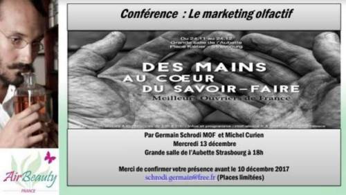Je partage le plaisir et l’honneur avec Michel Curien, de vous inviter à notre conférence sur l’application du marketing Olfactif, dans le cadre de la prestigieuse exposition des MOF à l’AUBETTE place Kleber le 13 décembre 2017 à 18H.