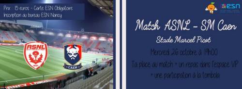 ESN Nancy vous propose d’assister au match ASNL - SM Caen qui compte pour la coupe de la ligue le mercredi 26 octobre et ce n’est pas tout, en plus de voir le match le club nous privatise l’espace VIP où un repas sera servi par un partenaire du club avant le début du match.