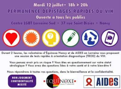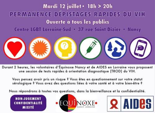 Durant 2 heures, les volontaires de AIDES et les bénévoles d’Équinoxe Nancy vous accueilleront de manière confidentielle pour bénéficier de cette session de tests rapides du VIH, gratuite et ouverte à tous les publics (LGBTI ou non).