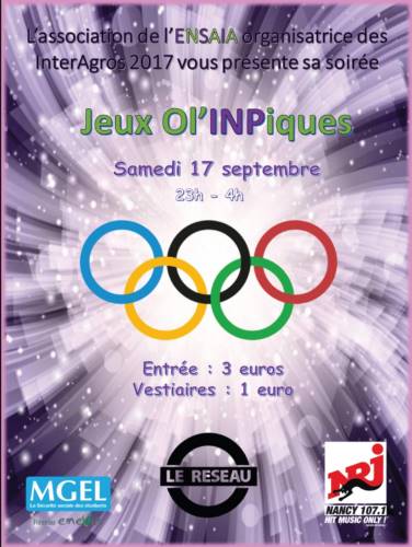 L’asso des InterAgros 2017 de l’ENSAIA organise pour sa première soirée au Réseau le Samedi 17 Septembre, sous le thème des Jeux Ol’INPiques!
