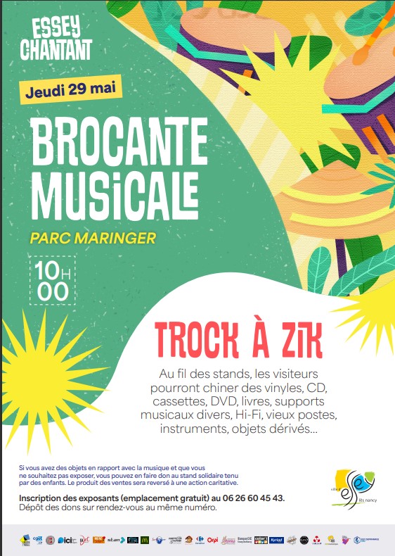 Lancée à l'occasion du 25ème anniversaire du festival Essey chantant, la Trock à Zik, brocante musicale, s'impose désormais comme un rendez-vous incontournable du festival Essey chantant et prendra place dès 10 heures dans les allées du Parc Maringer.